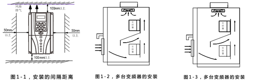 安裝間隔及距離要求,如圖1-1所示;多臺(tái)變頻器的安裝,如圖1-2所示,